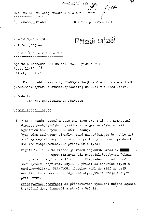 Signál "MIKY" - ve kterém je veden ing.KOHL Miroslav XXXX.1927 uprchlík, nyní USA st. přísl. t.č. bytem Belgie