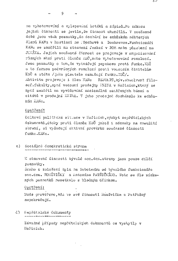 na vyhotovování a vylepování letáků a nápisů. Po zákazu jejich činnosti se jevilo, že činnost ukončili. V současné době jsou však poznatky, že dochází ke schůzkám některých členů KANu v hostinci na Dachově a Doubravce. Funkcionáři KANu se zaměřili na obsazení funkcí v ROH nebo působení na JUNÁKA. Jejich současná činnost se projevuje v organizování různých akcí proti členům KSČ, nebo vyhotovování rezolucí. Jsou poznatky o tom, že vytvářejí psychozu proti funkc. KSČ a to formou podvržených rezolucí proti vedoucím činitelům KSČ a státu /jako pisatele označují funkc. KSČ/.