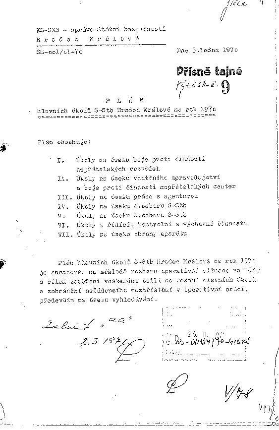 Plán hlavních úkolů S-Stb Hradec Králové na rok 1970 je zpracován na základě rozboru operativní situace ve VČK s cílem zaměření veškerého úsilí na řešení hlavních úkolů a zabránění nežádoucího roztříštění v operativní práci, především na úseku vyhledávání.