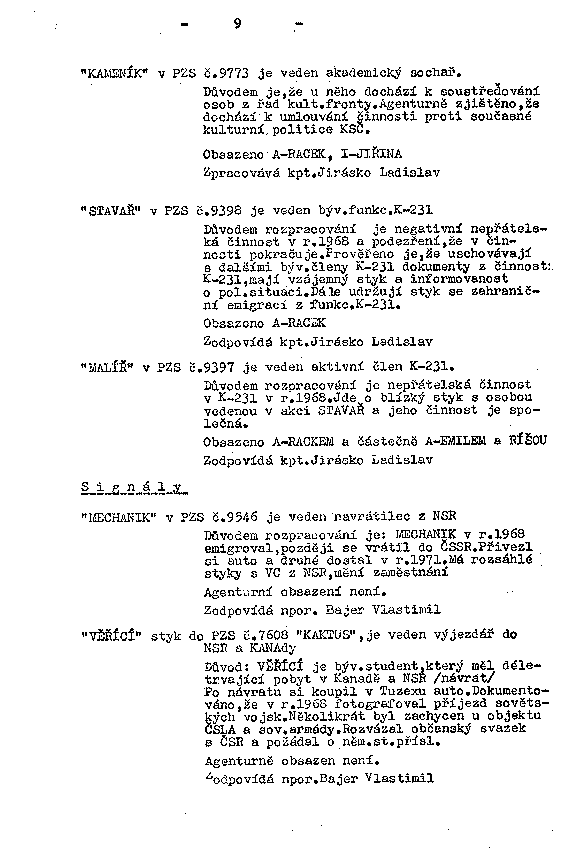 Důvodem rozpracování je negativní nepřátelská činnost v r.1968 a podezření, že v činnosti pokračuje. Prověřeno je, že uschovávají s dalšími býv.členy K-231 dokumenty z činnosti K-231, mají vzájemný styk a informovanost o pol.situaci. Dále udržují styk se zahraniční emigrací z funkc.K-231.