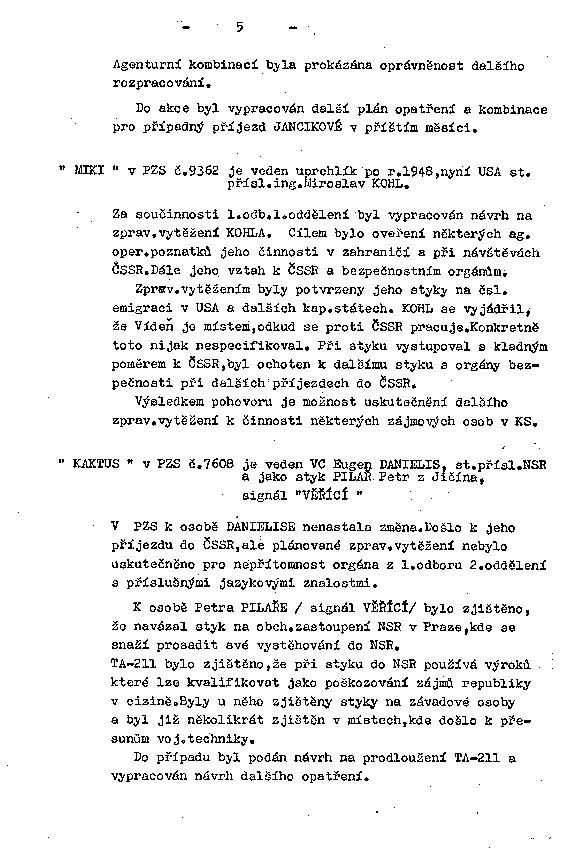 Zprav. vytěžením byly potvrzeny jeho styky na čsl. emigraci v USA a dalších kap.státech. KOHL se vyjádřil, že Vídeň je místem, odkud se proti ČSSR pracuje. Konkretně toto nijak nespecifikoval. Při styku vystupoval s kladným poměrem k ČSSR, byl ochoten k dalšímu styku s orgány bezpečnosti při dalších příjezdech do ČSSR.