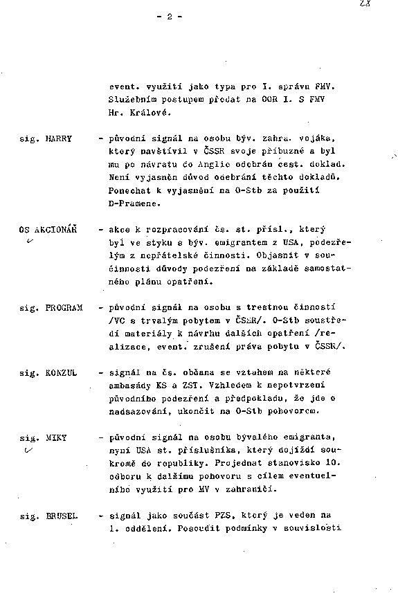 sig. PROGRAM - původní signál na osobu s trestnou činností /VC s trvalým pobytem v ČSSR/. O-Stb soustředí materiály k návrhu dalších opatření /realizace, event. zrušení práva pobytu v ČSSR/.