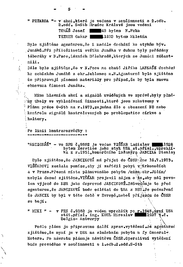 Bylo zjištěno, že JANCIKOVÁ má přijet do ČSSR dne 16.7.1973. VIŠŇAROVI zaslala peníze, aby jí zařídil pobyt v Krkonoších a v Praze. Přesná místa plánovaného pobytu /mimo okr.Jičín/ nebyla dosud zjištěna. VIŠŇAR projevil zájem o to, aby měl povolen výjezd do NSR jako doprovod JANCIKOVÉ. Zdůvodňuje to před agenturou, že JANCIKOVÁ bude odlétat do USA z NSR. Je podezření že JANCIK by byl v této době v Evropě, neboť příjezdu do ČSSR se bojí.