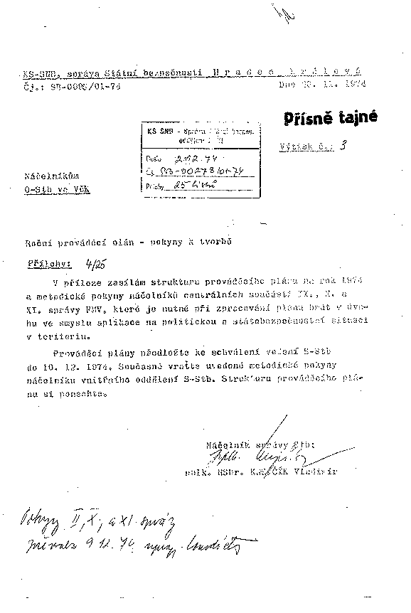 Prováděcí plány předložte ke schválení vedení S-Stb do 10.12.1974. Současně vraťte uvedené metodické pokyny náčelníku vnitřního oddělení S-Stb. Strukturu prováděcího plánu si ponechte.