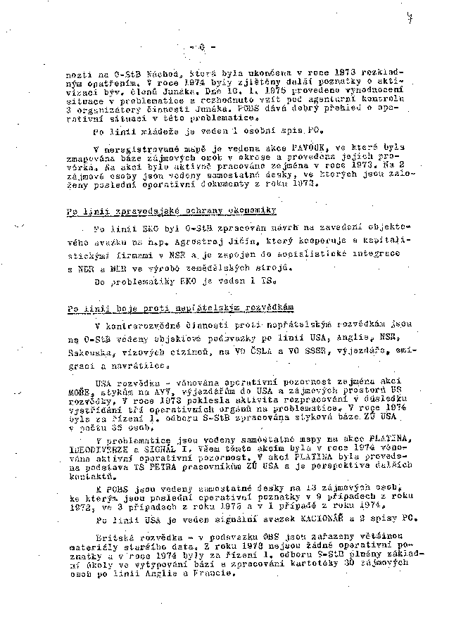 nosti na O-StB Náchod, která byla ukončena v roce 1973 rozkladným opatřením. V roce 1974 byly zjištěny další poznatky o aktivizaci býv. členů Junáka. Dne 10. 1. 1975 provedeno vyhodnocení situace v problematice a rozhodnuto vzít pod agenturní kontrolu 3 organizátory činnosti Junáka. POBS dává dobrý přehled o operativní situaci v této problematice.
