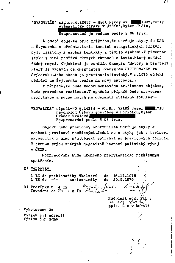 K osobě objekta bylo zjištěno, že udržuje styky do NSR a Švýcarska s představiteli tamních evangelických církví. Byly zjištěny i osobní kontakty s těmito osobami. V písemném styku s nimi používá různých zkratek a textu, který nedává žádný smysl. Objektovi je zasílán časopis "Hovory s pisateli" který je vydáván čs.emigrantem Přemyslem PITTERMANEM ve Švýcarsku. Jeho obsah je protisocialistický. V r.1975 objekt obdržel ze Švýcarska peníze na nový automobil.