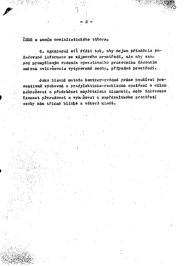 Jako hlavní metodu kontrarozvědné práce používat preventivně výchovná a profylakticko-rozkladná opatření s cílem zabraňovat a předcházet nepřátelské činnosti, nebo takovouto činnost přerušovat a vymaňovat z nepřátelského prostředí osoby nám třídně blízké a věkově mladé.