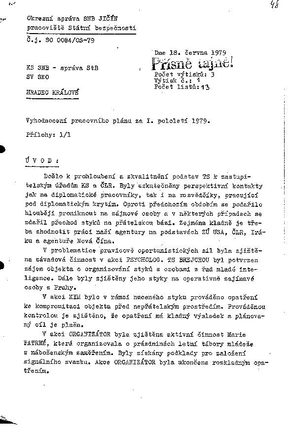 V problematice pravicově oportunistických sil byla zjištěna závadová činnost v akci PSYCHOLOG. TS BREJCHOU byl potvrzen zájem objekta o organizování styků s osobami z řad mladé inteligence. Dále byly zjištěny jeho styky na operativně zajímavé osoby z Prahy.