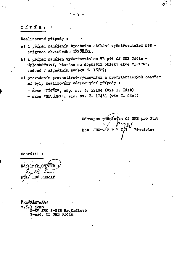 b) 1 případ zahájen vyšetřovatelem VB při OS SNB Jičín - úplatkářství, kterého se dopustil objekt akce "BRATR", vedené v signálním svazku č. 16727;