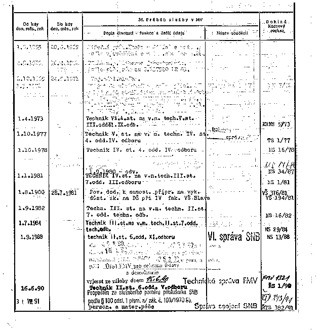 | 31. VII. 91 | Propuštěn ze služebního poměru příslušníka SNB podle § 100 odst. 1 písm. a/ zák.č. 100/1970 Sb. person. a mater.péče | Správa spojení SNB | ŘTD 373/91 ŘTS 382/91 | |