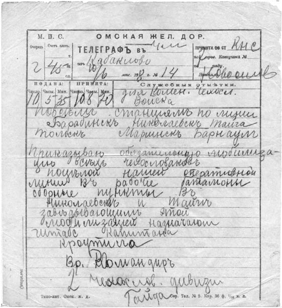 Nařizuji povinnou mobilizaci všech Čechoslováků-zajatců po celé naší operační linii do pracovních praporů na sběrná místa v Nikolajevsku a Tajze.
