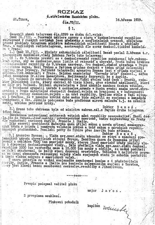 Rozkaz 6. střeleckému Hanáckému pluku.