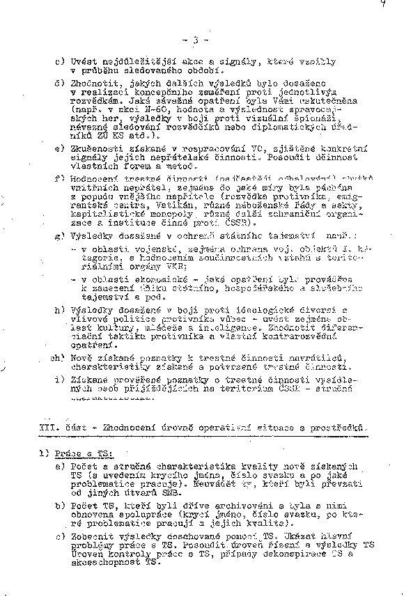 f) Hodnocení trestné činnosti (nejčastěji odhalování) zbytků vnitřních nepřátel, zejména do jaké míry byla páchána z popudu vnějšího nepřítele (rozvědka protivníka, emigrantská centra, Vatikán, různé náboženské řády a sekty, kapitalistické monopoly, různé další zahraniční organizace a instituce činné proti ČSSR) .