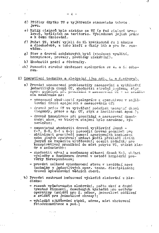 - samostatně zhodnotit úroveň vytěžování úkonů - C-7, H-8, E-4 a G-9, posoudit úroveň podmínek pro aktivizaci prostředí pomocí agenturních kombinací nebo jiných opatření, ukázat podíl překladů cizích jazyků na kapacitu vytěžování, ocenit podmínky pro konspirativní pronikání do míst pobytu VC, ukázat klady a nedostatky,