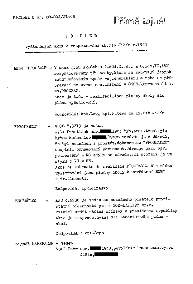Akce "PROGRAM" - V akci jsou sk. Stb a 5.odd. 2.odb. a 8.odb. II.SMV rozpracovávány tři osoby, které se zabývají jednak soustřeďováním zpráv voj. charakteru a nebo se připravují na zvrat soc. zřízení v ČSSR. Vypracovali t.zv. PROGRAM.