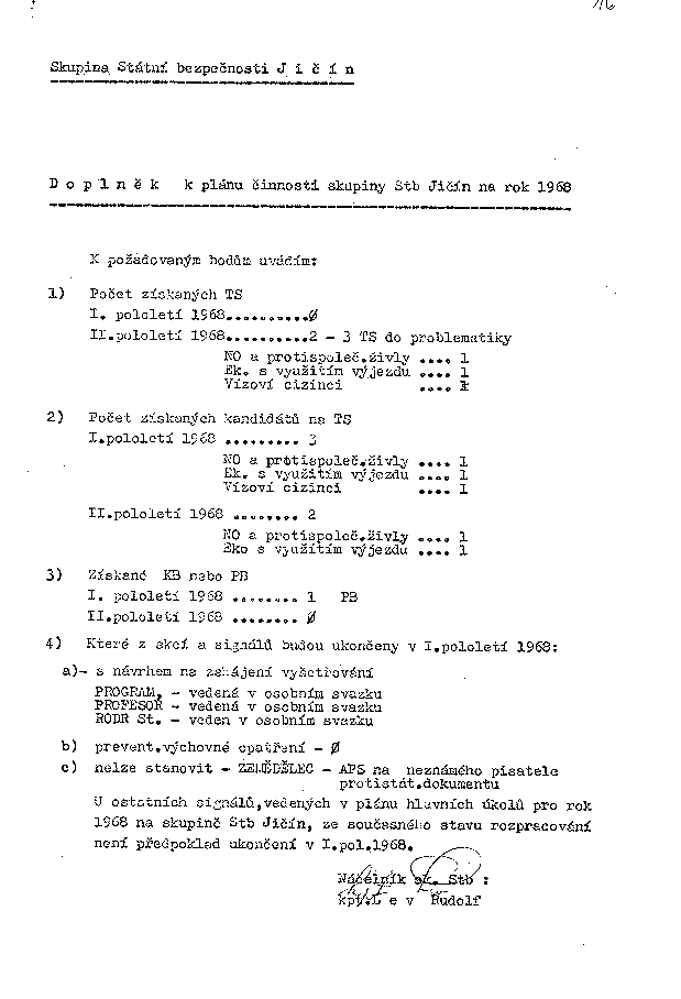 U ostatních signálů, vedených v plánu hlavních úkolů pro rok 1968 na skupině Stb Jičín, ze současného stavu rozpracování není předpoklad ukončení v I. pol. 1968.