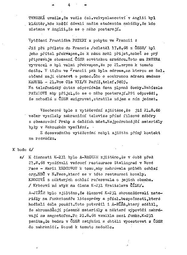 a/ K činnosti K-231 bylo A-RACKEM zjištěno, že v době před 21.8.68 využívali vedoucí restaurace Stalingrad v Nové Pace - Marii KRBCOVOU k tomu, aby nahrávala průběh schůzí org. KSČ v N. Pace, které se v této restauraci konaly. KRBCOVÁ z některých schůzi referovala o jejich obsahu. /Krbcová má styk na člena K-231 Vratislava ČÍLU/ .