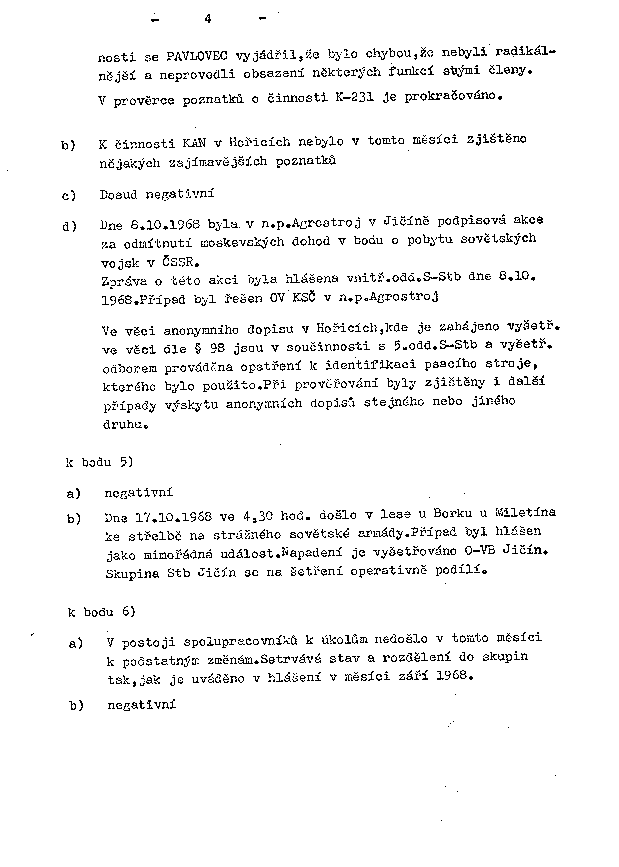 b) Dne 17.10.1968 ve 4,30 hod. došlo v lese u Borku u Miletína ke střelbě na strážného sovětské armády. Případ byl hlášen jako mimořádná událost. Napadení je vyšetřováno O-VB Jičín. Skupina Stb Jičín se na šetření operativně podílí.