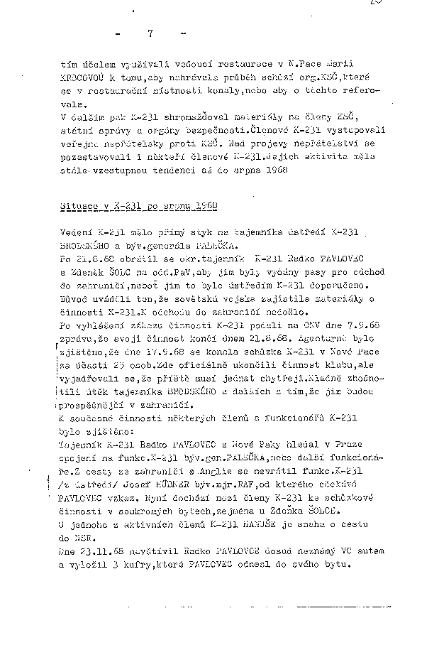 Po 21.8.68 obrátil se okr.tajemník K-231 Radko PAVLOVEC a Zdeněk ŠOLC na odd.PaV, aby jim byly vydány pasy pro odchod do zahraničí, neboť jim to bylo ústředím K-231 doporučeno. Důvod uváděli ten, že sovětská vojska zajistila materiály o činnosti K-231. K odchodu do zahraničí nedošlo.