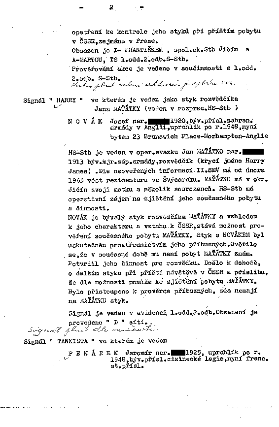 HS-Stb je veden v oper.svazku Jan MAŤÁTKO nar. XX.XX.1913 býv.mjr.záp.armády, rozvědčík (krycí jméno Harry James) . Dle neověřených informací II.SMV má od února 1965 vést rezidenturu ve Švýcarsku. MAŤÁTKO má v okr. Jičín svoji matku a několik sourozenců. HS-Stb má operativní zájem na zjištění jeho současného pobytu a činnosti.
