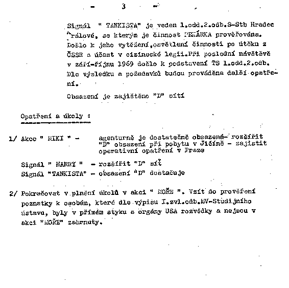 Signál "TANKISTA" je veden 1.odd.2.odb.S-Stb Hradec Králové, se kterým je činnost PEKÁRKA prověřována. Došlo k jeho vytěžení, osvětlení činnosti po útěku z ČSSR a účast v cizinecké legii. Při poslední návštěvě v září-říjnu 1969 došlo k podstavení TS 1.odd.2.odb. Dle výsledku a požadavků budou prováděna další opatření.