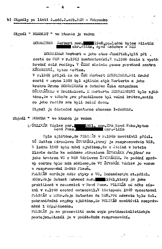 V r.1969 přijel 2x do ČSR Herbert SCHREIBER. Při druhé cestě v srpnu 1969 byl zjištěn styk Herberta a jeho bratra Bruno SCHREIBERA s četařem ČsLa Antonínem BŘICHÁČKEM v Bratislavě. K Herbertu SCHREIBROVI bylo zjištěno, že v táboře pro přesídlence byl velmi krátce, zatím co jeho rodiče zde byli delší dobu.