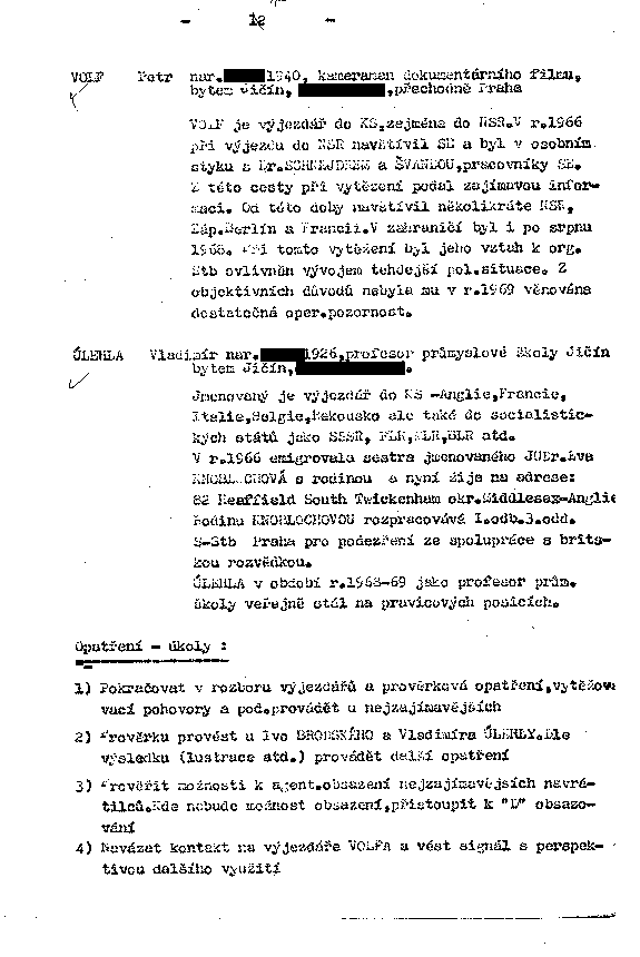 VOLF Petr nar. XX.X.1940, kameraman dokumentárního filmu, bytem Jičín, XXXXXXXXXX, přechodně Praha