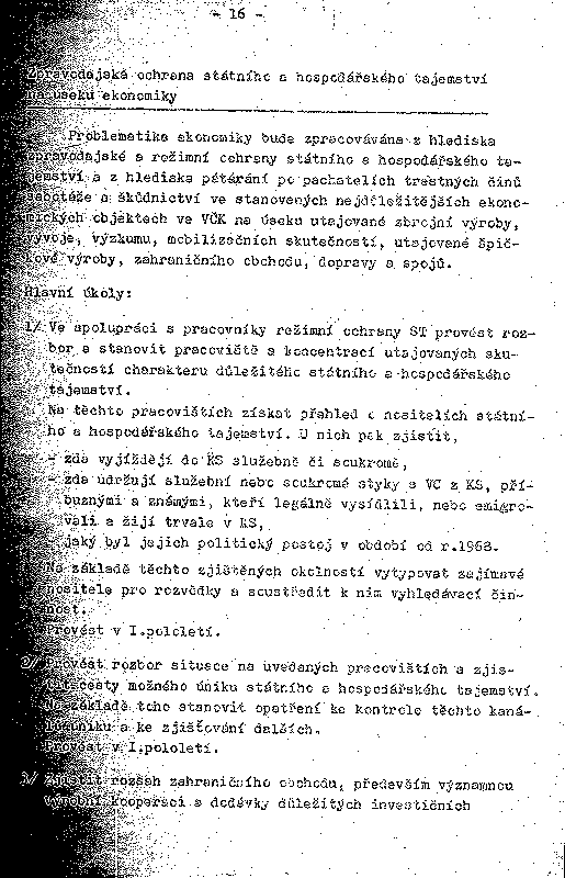 Problematika ekonomiky bude zpracovávána z hlediska zpravodajské a režimní ochrany státního a hospodářského tajemství a z hlediska pátrání po pachatelích trestných činů sabotáže a škůdnictví ve stanovených nejdůležitějších ekonomických objektech ve VČK na úseku utajované zbrojní výroby, vývoje, výzkumu, mobilizačních skutečností, utajované špičkové výrobky, zahraničního obchodu, dopravy a spojů.