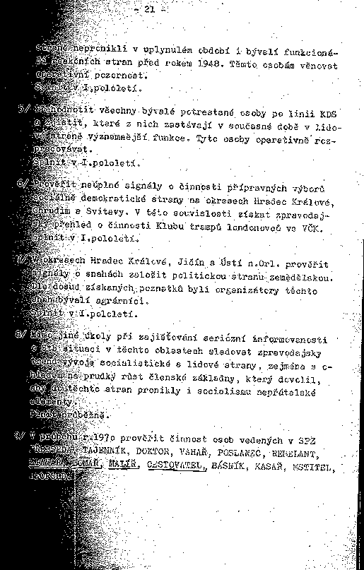5/ Přehodnotit všechny bývalé potrestané osoby po linii KDS a zjistit, které z nich zastávají v současné době v lidové straně významnější funkce. Tyto osoby operativně rozpracovávat.