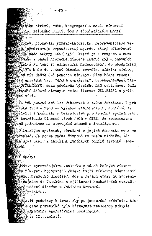 1/ Zajistit zpravodajskou kontrolu u všech čelných církevních řím.kat. hodnostářů /kteří tvoří církevní hierarchii v rámci hradecké diecése/. Jde o jejich styky do zahraničí, zejména do Vatikánu a zjišťování konkrétních pokynů, které vedení diecése z Vatikánu dostává.