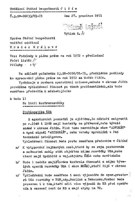 Z agenturních poznatků je zjištěno, že někteří emigranti po r.1948 i 1968 mají kontakty na příbuzné, nebo bývalé známé v okrese Jičín. Plně tomu nasvědčuje akce "ADVOKÁT" a nyní signál "AKCIONÁŘ", nebo vztahy uprchlíků z řad technické inteligence.