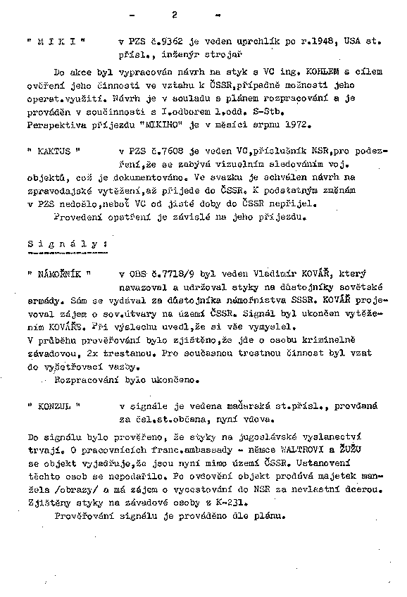 "KAKTUS" v PZS č.7608 je veden VC, příslušník NSR, pro podezření, že se zabývá vizuelním sledováním voj.objektů, což je dokumentováno. Ve svazku je schválen návrh na zpravodajské vytěžení, až přijede do ČSSR. K podstatným změnám v PZS nedošlo, neboť VC od jisté doby do ČSSR nepřijel.