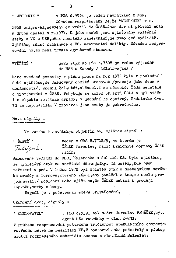 Jmenovaný vyjíždí do NSR, Holandska a dalších KS. Bylo zjištěno, že vyhledává styk na sovětské důstojníky. Má dotazy, kde jsou zařazeni a pod. V lednu 1972 byl zjištěn styk s důstojníkem sovětské armády z Turnova, kterého žádal, aby pomlčel o tom, co spolu projednávali. V poslední době zjištěno, že ČÁLEK nabízí k prodeji záp.něm. marky a bony.