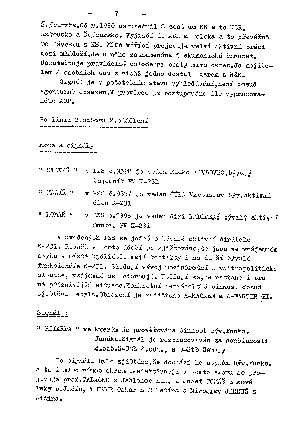 Do signálu bylo zjištěno, že dochází ke stykům býv.funkc. a to i mimo rámec okresu. Nejaktivněji v tomto směru se projevuje prof. TALACKO z Jablonce n.N. a Josef TOMÁŠ z Nové Paky o.Jičín, TEIMER Oskar z Miletína a Miroslav JIROUŠ z Jičína.