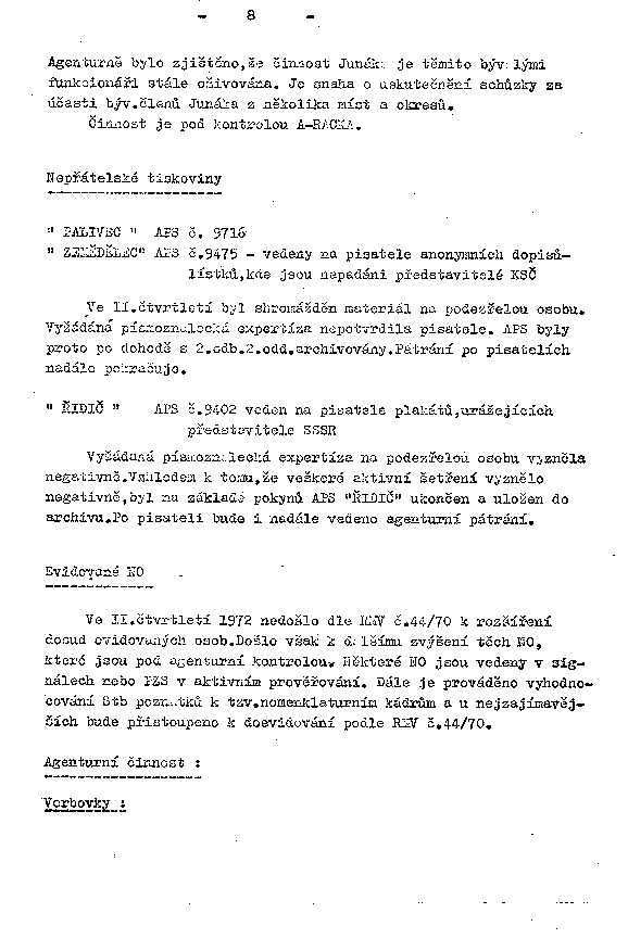 Ve II.čtvrtletí 1972 nedošlo dle RMV č.44/70 k rozšíření dosud evidovaných osob. Došlo však k dalšímu zvýšení těch NO, které jsou pod agenturní kontrolou. Některé NO jsou vedeny v signálech nebo PZS v aktivním prověřování. Dále je prováděno vyhodnocování Stb poznatků k tzv.nomenklaturním kádrům a u nejzajímavějších bude přistoupeno k doevidování podle RMV č.44/70.