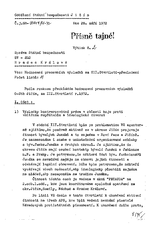 V období III.čtvrtletí bylo po problematice VZ agenturně zjištěno, že poměrně aktivně se v okrese Jičín projevuje činnost bývalých Junáků a to zejména v Nové Pace a Jičíně. Je zaznamenána i snaha o uskutečnění organizované schůzky s býv.funkc.Junáka z druhých okresů. Je zjištěno, že do okresu Jičín mají osobní kontakty bývalí Junáci z Jablonce n.N. a Prahy. Je potvrzeno, že některá část býv. funkcionářů Junáka se nevzdává naděje na obnovu jejich činnosti a očekávají legální obnovení. Dále bylo potvrzeno, že někteří využívají všech možností, aby ideologicky působili zejména na mládež, aby nezapoměla na tradice Junáka.