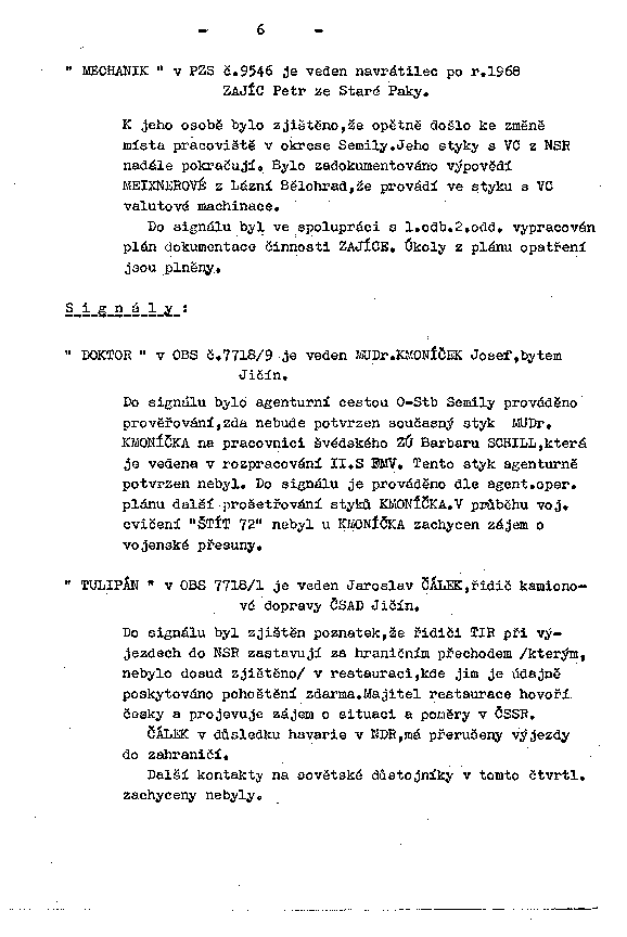 K jeho osobě bylo zjištěno, že opětně došlo ke změně místa pracoviště v okrese Semily. Jeho styky s VC z NSR nadále pokračují. Bylo zadokumentováno výpovědí MEIXNEROVÉ z Lázní Bělohrad, že provádí ve styku s VC valutové machinace.