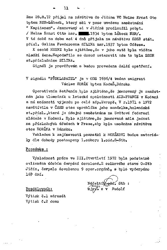 Operativním šetřením bylo zjištěno, že jmenovaný je zaměstnán jako tlumočník u letecké společnosti AIR-FRANCE v Kodani a má možnosti výjezdu po celé záp.Evropě. V r.1971 a 1972 navštívila v ČSSR otce uprchlíka jeho manželka, holandská st.přísl., která je údajně zaměstnána na Světové federaci mládeže v Kodani. Bylo zjištěno, že jmenovaná měla jednat na příslušných úřadech v Praze, aby byla umožněna návštěva otce HORÁKA v Dánsku.