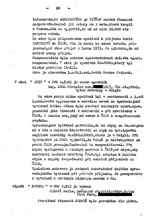 Do akce bylo připravováno opatření k příjezdu Marie JANCIKOVÉ do ČSSR. Již 3x došlo ke změně termínu příjezdu. Nyní chce přijet v lednu 1973. Je zjištěno, že má určité obavy přijet.