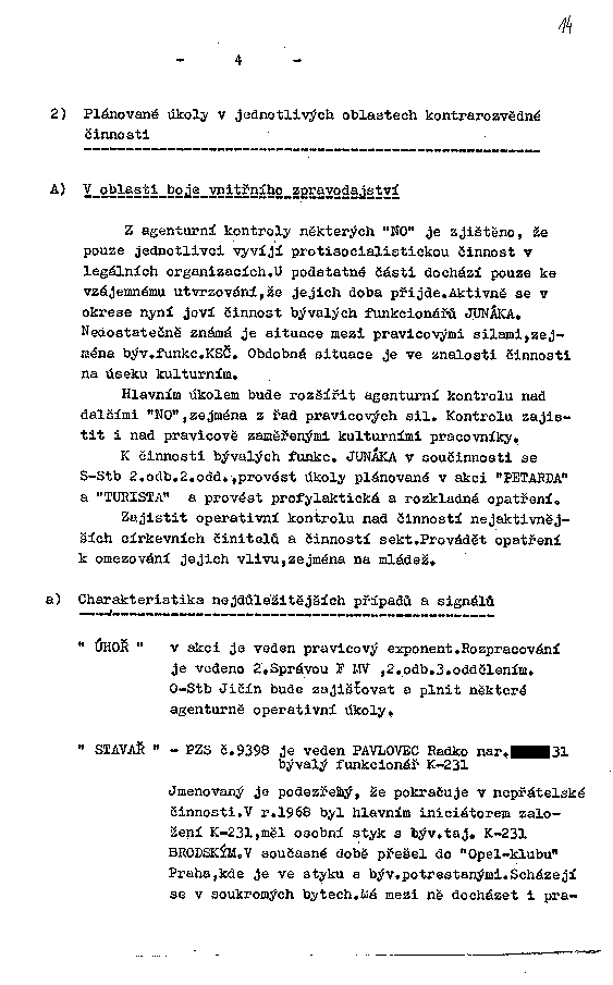 K činnosti bývalých funkc. JUNÁKA v součinnosti se S-Stb 2.odb.2.odd., provést úkoly plánované v akci "PETARDA" a "TURISTA" a provést profylaktická a rozkladná opatření.