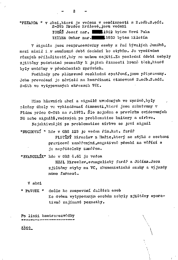 Mimo hlavních akcí a signálů uvedených ve zprávě, byly plněny úkoly ve vyhledávací činnosti, které jsou zakotveny v Plánu práce O-Stb na r.1973. Šlo zejména o prověrku evidovaných NO nebo signálů, vedených po problematice kultury a církve.