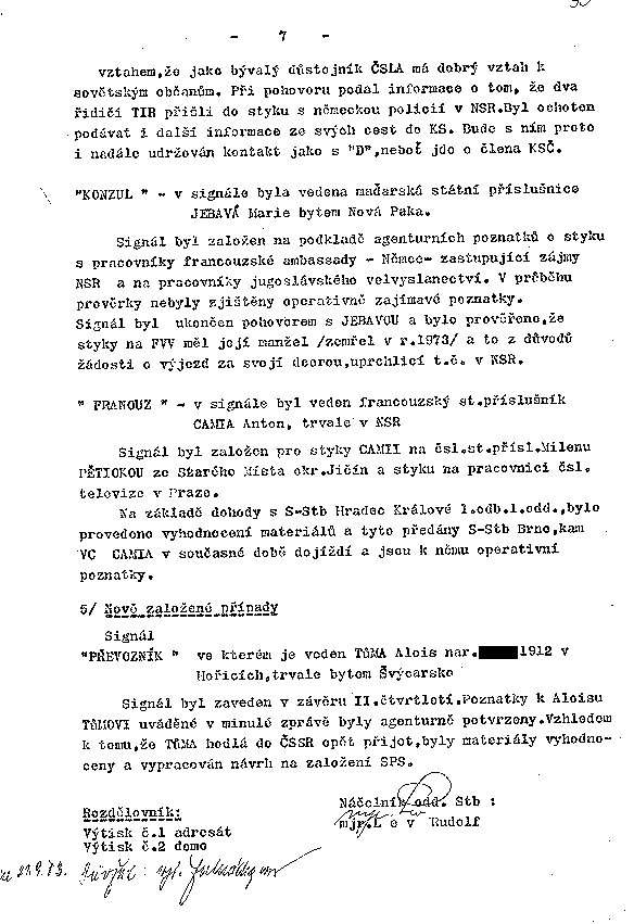 Signál byl založen na podkladě agenturních poznatků a styku s pracovníky francouzské ambassady - Němec- zastupující zájmy NSR a na pracování jugoslávského velvyslanectví. V průběhu prověrky nebyly zjištěny operativně zajímavé poznatky.