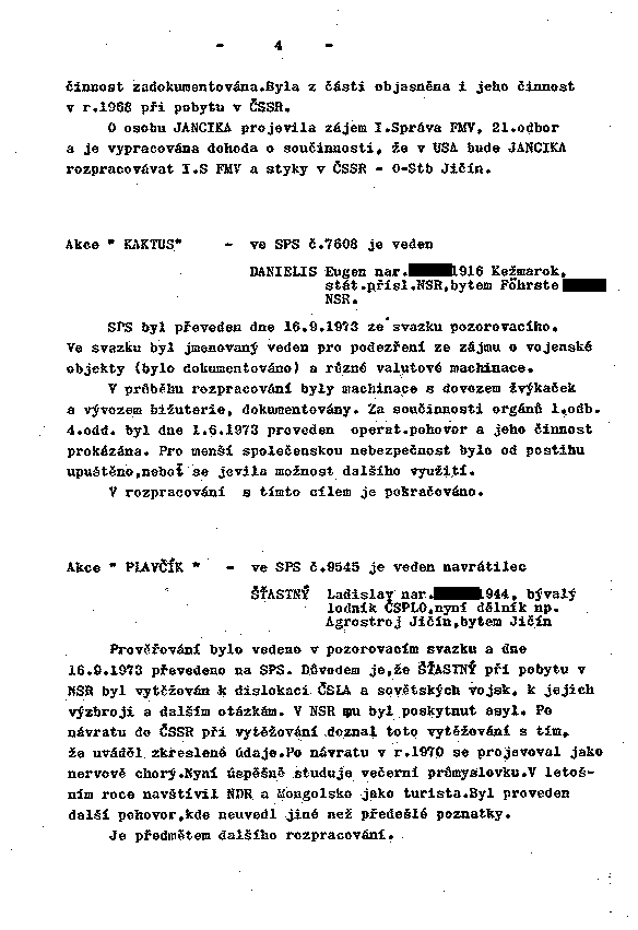činnost zadokumentována. Byla z části objasněna i jeho činnost v r.1968 při pobytu v ČSSR.