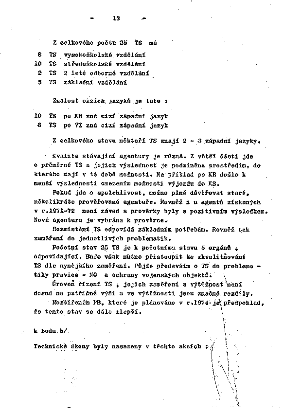 Pokud jde o spolehlivost, možno plně důvěřovat staré, několikráte prověřované agentuře. Rovněž i u agentů získaných v r.1971-72 není závad a prověrky byly s pozitivním výsledkem. Nová agentura je vybrána k prověrce.