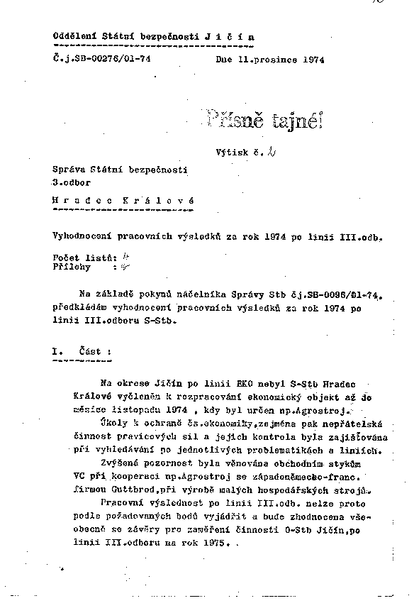 Na základě pokynů náčelníka Správy Stb čj.SB-0096/01-74, předkládám vyhodnocení pracovních výsledků za rok 1974 po linii III.odboru S-Stb.