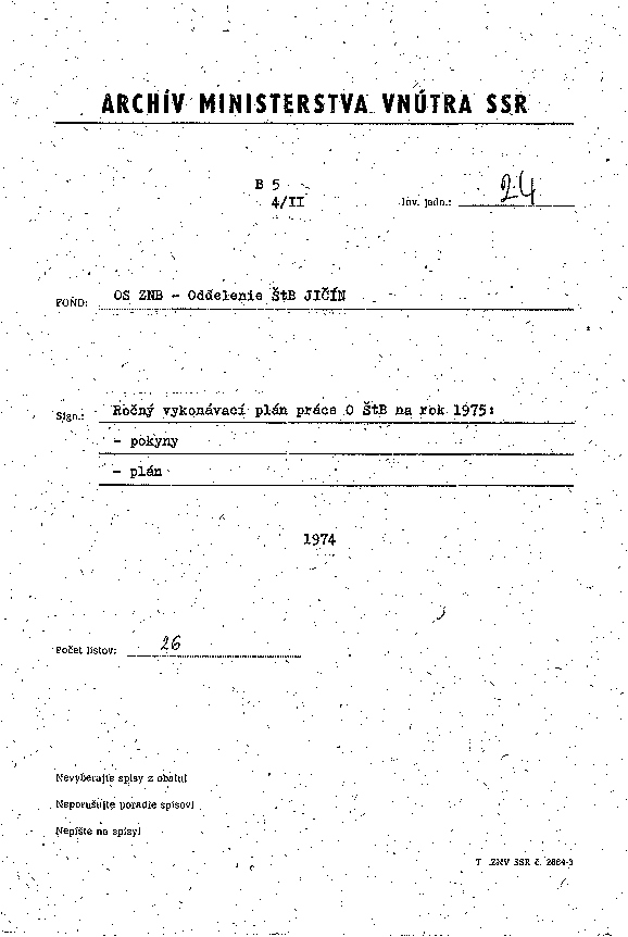 Sign.: Ročný vykonávací plán práce O ŠtB na rok 1975: