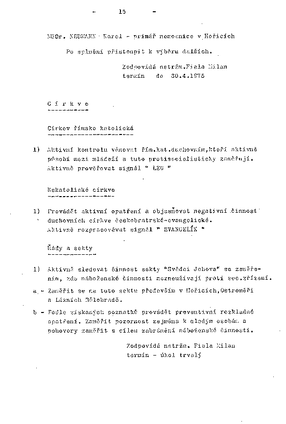 1) Aktivně sledovat činnost sekty "Svědci Jehova" se zaměřením, zda náboženské činnosti nezneužívají proti soc.zřízení.