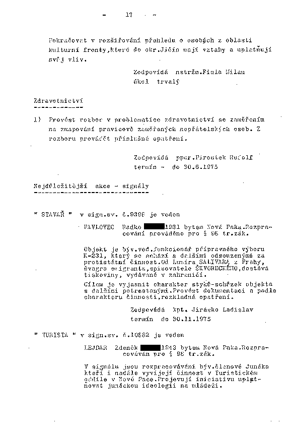 Prováděcí plán činnosti O-StB Jičín na rok 1975