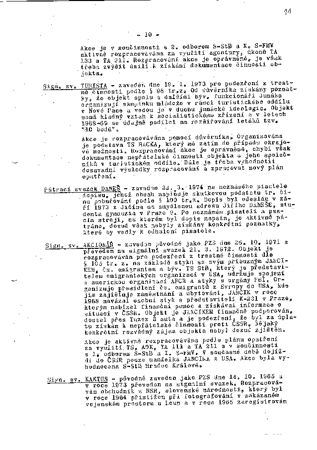 Sign. sv. AKCIONÁŘ - zaveden původně jako PZS dne 25. 10. 1971 a převeden na signální svazek 21. 3. 1972. Objekt je rozpracováván pro podezření z trestné činnosti dle § 105 tr. z. na základě styku se svým příbuzným JANCIKEM, čs. emigrantem a býv. TS StB, který je představitelem emigrantských organizací v USA, udržuje spojení s americkou organizací AFCR a styky s orgány FBI. Organizuje přesídlení čs. emigrantů z Evropy do USA, kde jim zajišťuje zaměstnání a ubytování. JANCIK v roce 1968 navázal osobní styk s představiteli K-231 v Praze, kterým nabízel finanční pomoc a získával informace o situaci v ČSSR. Objekt je JANCIKEM finančně podporován, dostal přes Tuzex 3 auta a je podezření, že byl za úplatu získán k nepřátelské činnosti proti ČSSR. Nějaký konkretní rozvědný zájem objekta nebyl dosud zjištěn.