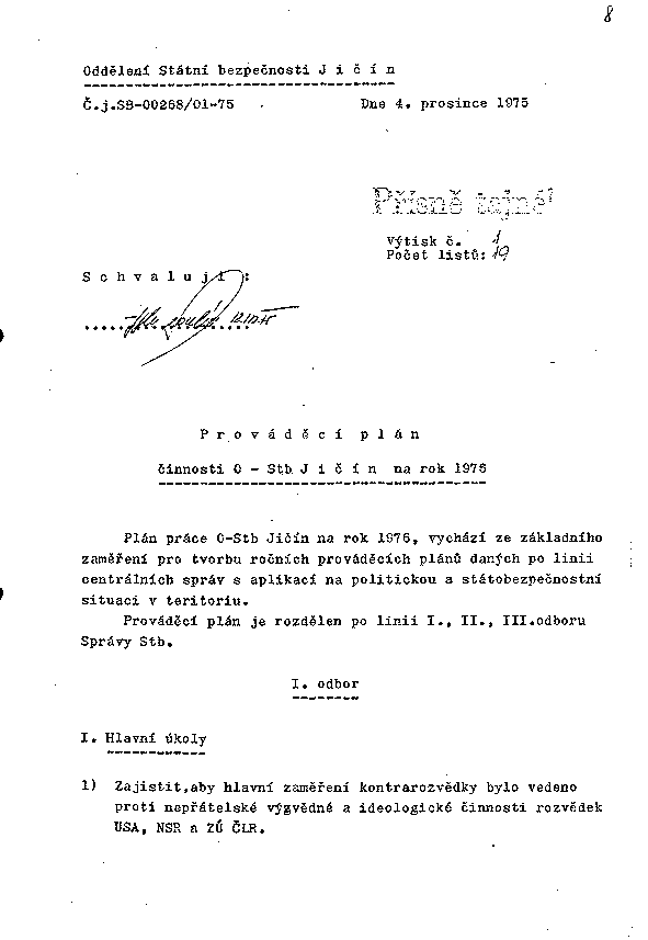 Plán práce O-Stb Jičín na rok 1976, vychází ze základního zaměření pro tvorbu ročních prováděcích plánů daných po linii centrálních správ s aplikací na politickou a státobezpečnostní situaci v teritoriu.